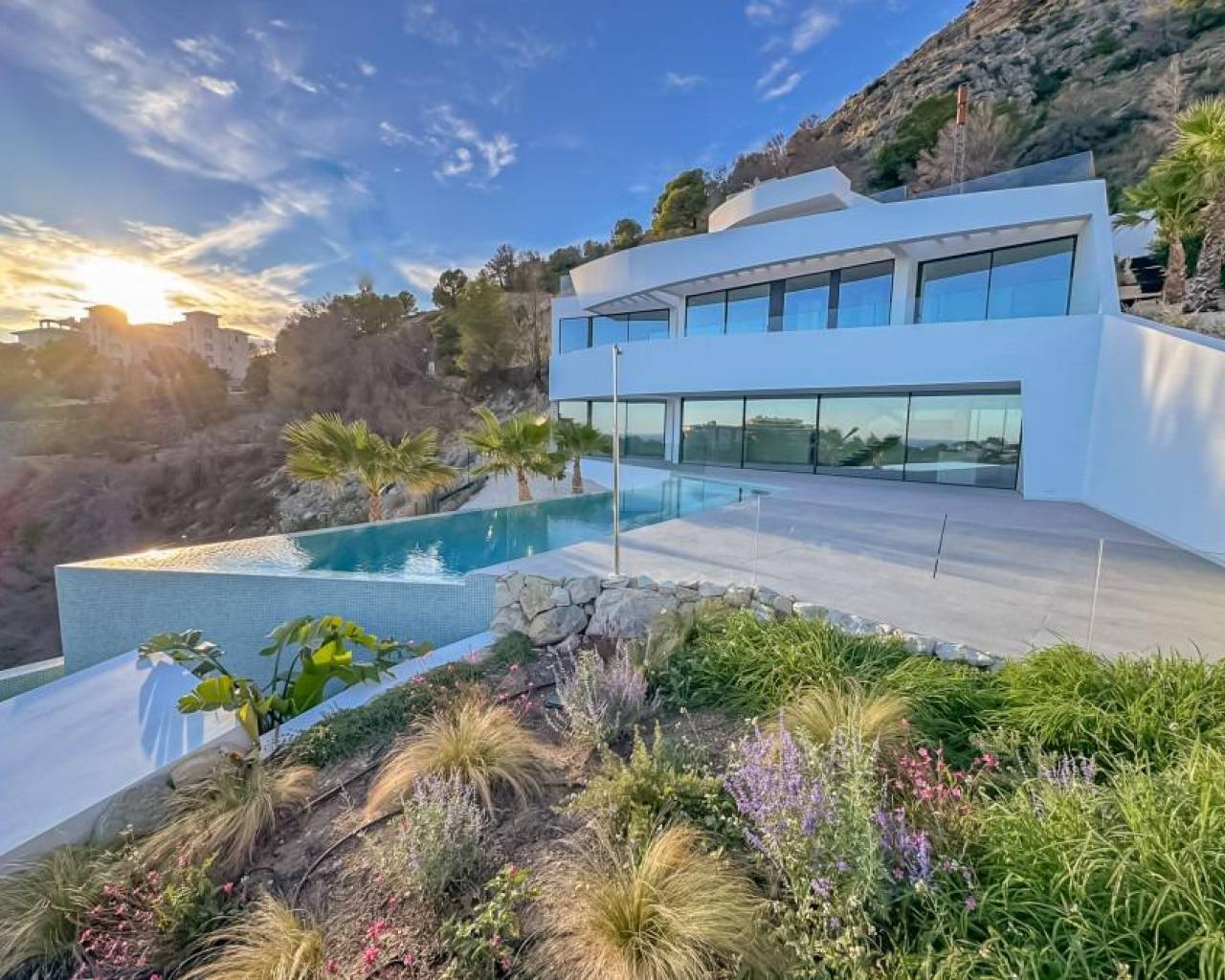 Esta exclusiva villa de lujo ha sido diseñada por el estudio de arquitectura Ramón Gandia Brull y es uno de los mejores ejemplos de arquitectura contemporánea que crea una abundancia de geometría, luz y espacio.. . Esta propiedad excepcional se encuentra en una parcela maravillosa en Altea Hills, un complejo residencial premium cerca de la costa mediterránea. La zona se caracteriza por enormes espacios verdes, zonas de bosque y pinos, con las más maravillosas vistas al mar abierto.. . La planta baja cuenta con 1 dormitorio doble con baño en suite, 1 aseo para invitados y un espacio diurno de 66m2: cocina y salón abiertos a una terraza cubierta y la zona chill out con una increíble piscina infinita y jacuzzi. El primer piso es un área de descanso y dormitorio: 3 dormitorios en suite, incluido el dormitorio principal con grandes terrazas abiertas.. . La villa se encuentra dentro del complejo Altea Hills y disfruta de seguridad las 24 horas cerca de la costa mediterránea. Altea Hills dispone de Hotel, bares, restaurantes y se encuentra a pocos minutos del bonito pueblo de Altea, de la Marina Campomanes deportiva y tiene fácil acceso a la autovía. A menos de 10 minutos en coche de la playa y Altea, a 15 minutos de Calpe y aproximadamente a 1 hora del aeropuerto de Alicante o Valencia.. . El clima en Altea es soleado con más de 300 días de sol al año con temperaturas medias de 27 ° C en verano y 17 ° C en invierno, lo que favorece la práctica de deportes al aire libre que ha llenado la zona de Campos de Golf. Canchas de tenis, Rutas de senderismo y clubes náuticos..